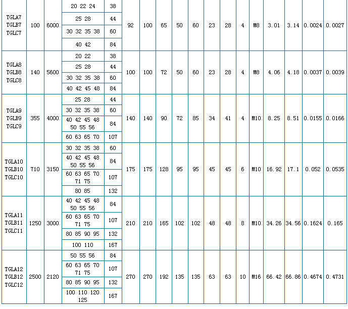 注:1、瞬時過載轉矩不得大于公稱轉矩的2倍。 2、質量和轉動慣量是各型號中*大值的近似計算值。 3、B1是保證原動機或工作機安裝所必需的*小尺寸。 4、推薦TGL10~TGL12采用B型。 TGL聯軸器許用補償量 |