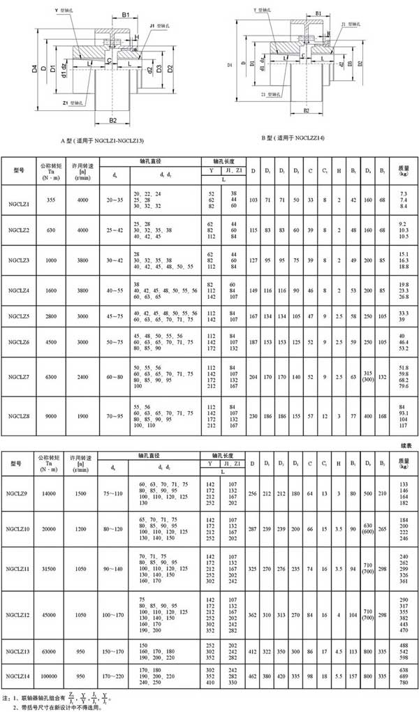 大轉矩鼓形齒式聯軸器承載沖擊性能好,但齒面接觸應力和齒根彎曲疲勞強度要求高,如果我們采取特殊結構、特殊材料、特殊工藝,那么該聯軸器就能夠滿足大直徑軋管機的要求。隨著我國經濟的發展,大直徑軋管機需求增加,其主傳動使用聯軸器的要求也越來越高,滿足該要求的聯軸器有十字式萬向聯軸器和大轉矩鼓形齒式聯軸器,其中十字式萬向聯軸器轉矩可以達到,但承載沖擊性能差、壽命短,這是一個很大的缺點;目前國內軋機用的標準聯軸器無法滿足要求,只達到需求轉遞轉矩的1/2~1/3,國外聯軸器專業制造商可以滿足要求,但由于它采用專門的技術,再加上制造難度大,所以價格特別昂貴。一臺軋管機需要10套左右,再加上備件外購費用很大。天碩聯軸器廠根據客戶需求研制的各種鼓形齒聯軸器已能滿足國內各廠家的需求。所謂鼓形齒即為將外齒制成球面,球面中心在齒輪軸線上,齒側間隙較一般齒輪大,鼓形齒聯軸器可允許較大的角位移(相對于直齒聯軸器),可改善齒的接觸條件,提高傳遞轉矩的能力,延長使用壽命。有角位移時沿齒寬的接觸狀態。具有徑向、軸向和角向等軸線偏差補償能力,具有結構緊湊、回轉半徑小、承載能力大、傳動效率高、噪聲低及維修周期長等優點,特別適用于低速重載工況,如冶金、礦山、起重運輸等行業、也適用于石油、化工、通用機械等各類機械的軸系傳動鼓形齒式聯軸器屬于剛撓性聯軸器,齒式聯軸器是由齒數相同的內齒圈和帶外齒的凸緣半聯軸器等零件組成。外齒分為直齒和鼓形齒兩種齒形,齒式聯軸器在工作時,兩軸產生相對角位移,內外齒的齒面周期性作軸向相對滑動,必然形成齒面磨損和功率消耗,因此,齒式聯軸器需在有良好和密封的狀態下工作。齒式聯軸器徑向尺寸小,承載能力大,常用于低速重載工況條件的軸系傳動,高精度并經動平衡的齒式聯軸器可用于高速傳動,如燃汽輪機的軸系傳動。 NGCLZ型帶制動輪鼓形齒式聯軸器 基本參數和主要尺寸
