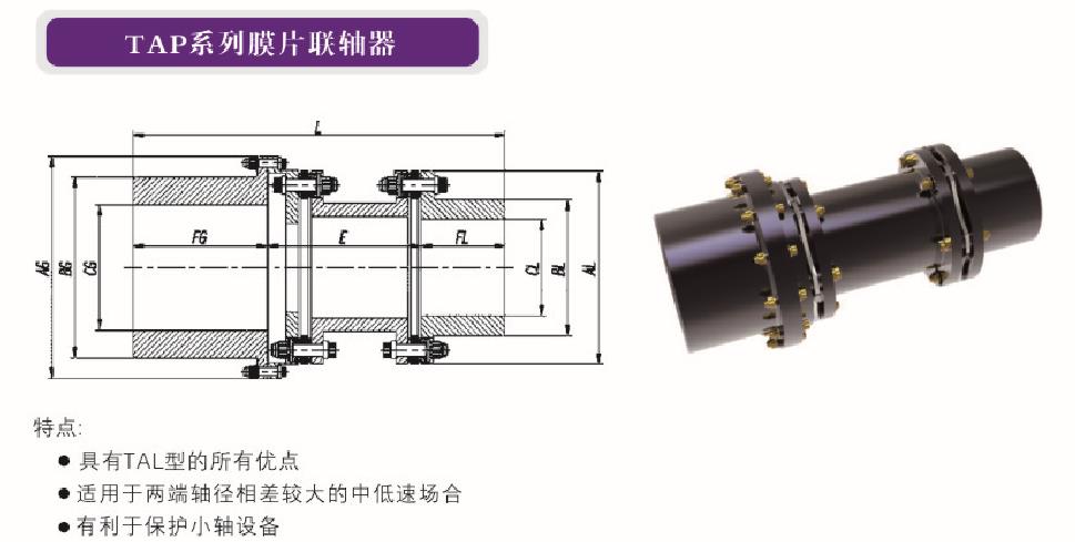 聯(lián)軸器型號 功率 / 轉(zhuǎn)速 (Kw/rpm) 公稱扭矩 (KNm) 峰值扭矩 (KNm) *大許用轉(zhuǎn)速 (r/min) AG/AL (mm) BG/BL (mm) CG/CL max (mm) E(mm) FG/FL (mm) L(mm) TAP6115 0.072 0.68 2.4 15000 146/115 98/74 70/50 110 75 260 TAP6135 0.16 1......