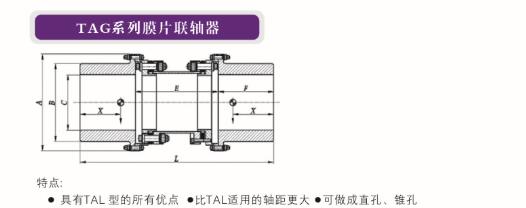 聯軸器型號 功率 / 轉速 (Kw/rpm) 公稱扭矩 (KNm) 峰值扭矩 (KNm) *大許用轉速 (r/min) A (mm) B (mm) C(mm)max E(mm) F (mm) L(mm) TAG6115 0.072 0.68 2.4 32000 146 98 70 110 75 260 TAG6135 0.16 1.52 3.3 28000 165 119 85 110......
