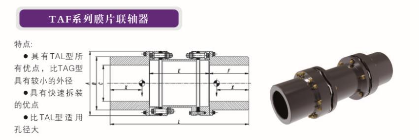 聯(lián)軸器型號 功率 / 轉(zhuǎn)速 (Kw/rpm) 公稱扭矩 (KNm) 峰值扭矩 (KNm) *大許用轉(zhuǎn)速 (r/min) A (mm) B (mm) C(mm)max E(mm) F (mm) L(mm) TAF6115 0.072 0.68 2.4 15000 117 90 60 140 75 290 TAF6135 0.16 1.52 3.3 12000 137 113 75 140......