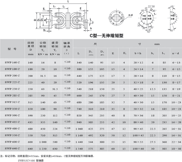 SWC型、SWP型十字軸式萬向聯軸器的主要特點為:1.具有較大的角度補償能力。2.結構緊湊合理。SWC型采用整體式叉頭,使運載更具可靠性。3.承載能力大。與回轉直徑相同的其它型式的聯軸相比較,其所傳遞的扭矩更大,此對回轉直徑受限制的機械設備,其配套范圍更具優(yōu)越性。4.傳動效率高。其傳動效率達98-99.8%,用于大功率傳動,節(jié)能效果明顯。5.運載平穩(wěn),噪聲低,裝拆維護方便。
